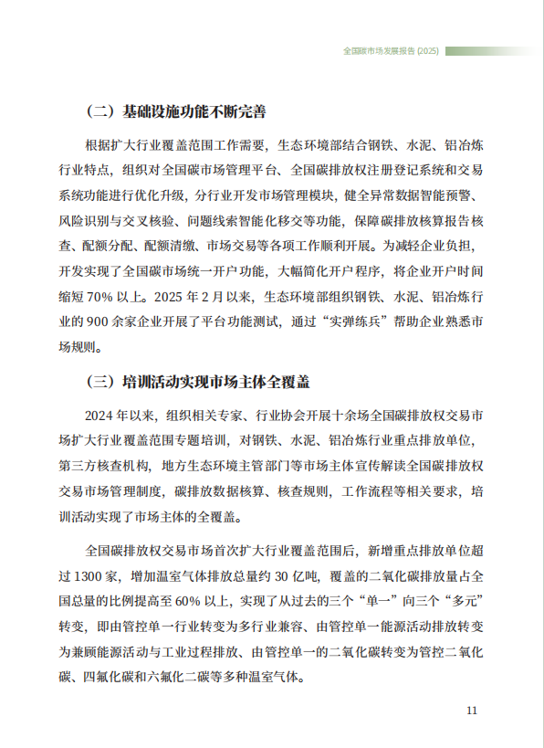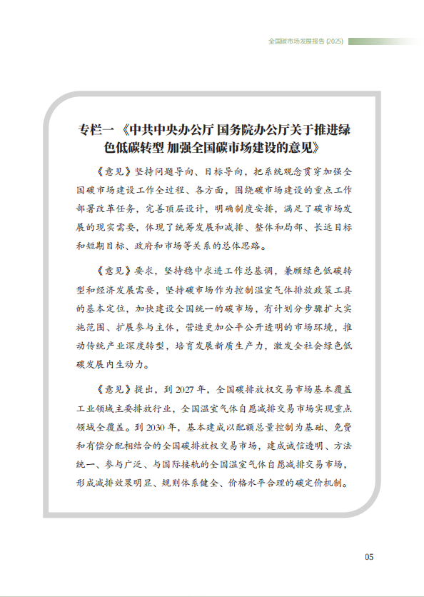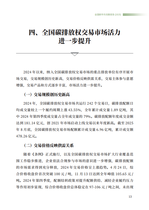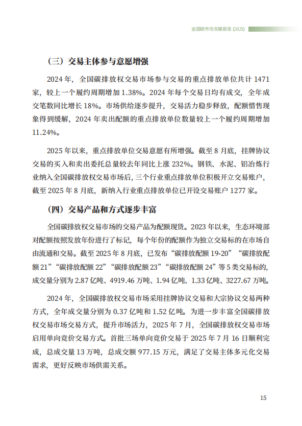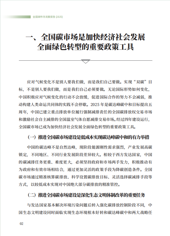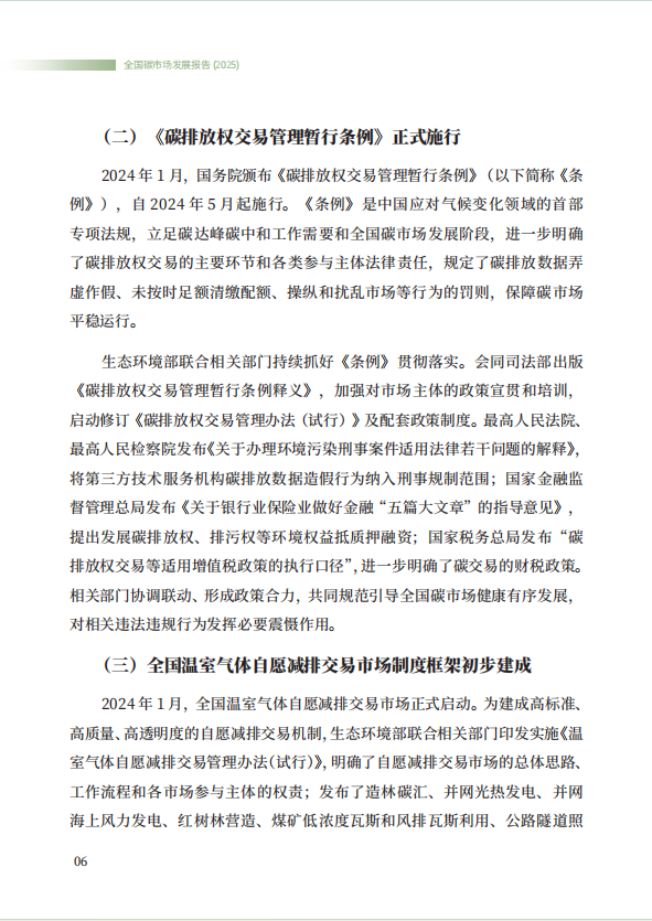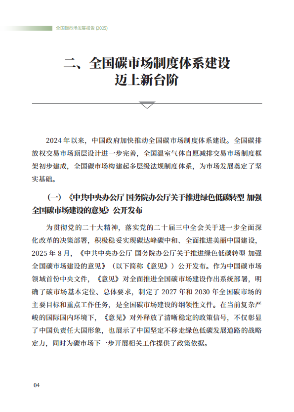 《全国碳市场发展报告(2025)》系统总结了全国碳排放权交易市场和全国温室气体自愿减排交易市场的最新建设进展,全方位展示了市场建设运行成效,展望了全国碳市场未来发展方向,是继2024年《全国碳市场发展报告(2024)》之后,生态环境部发布的全国碳市场最新进展情况报告。