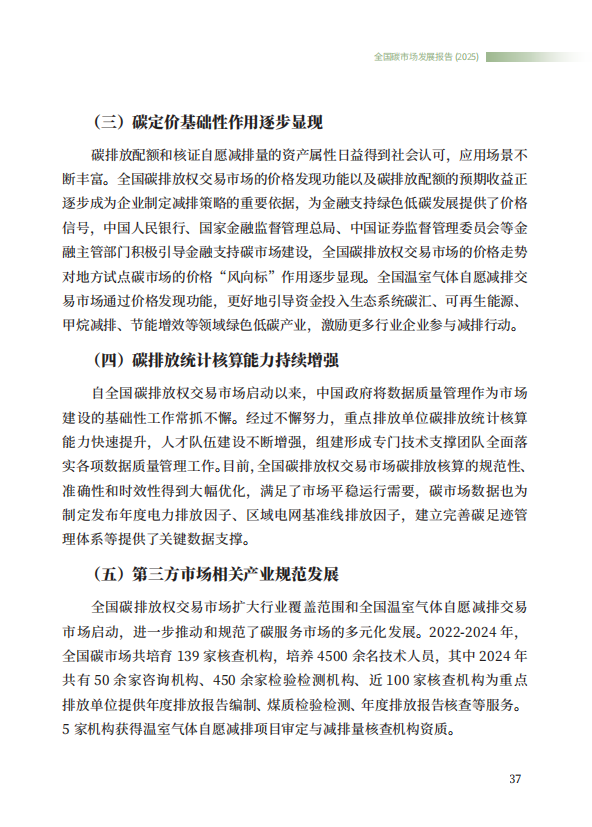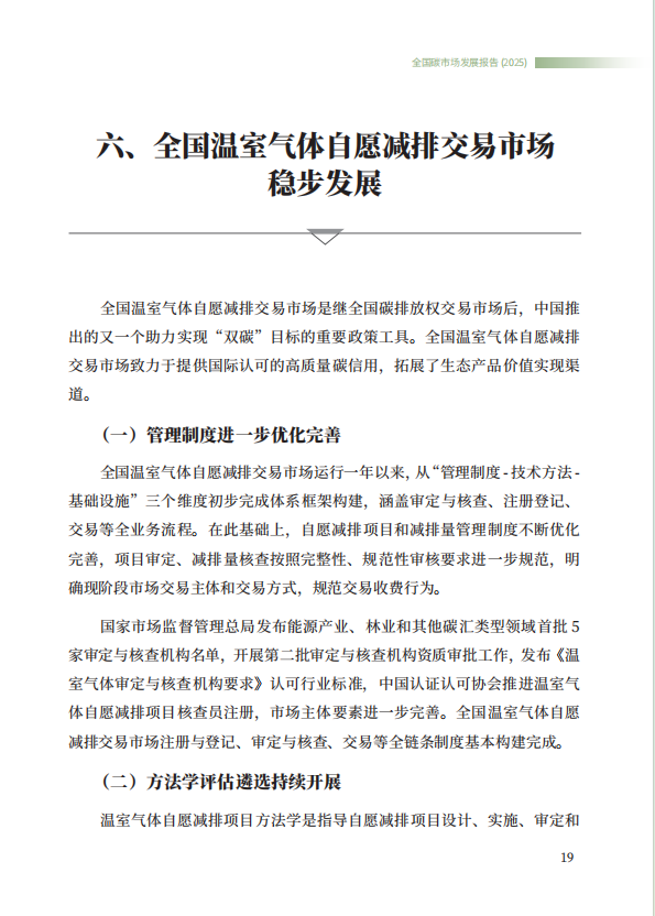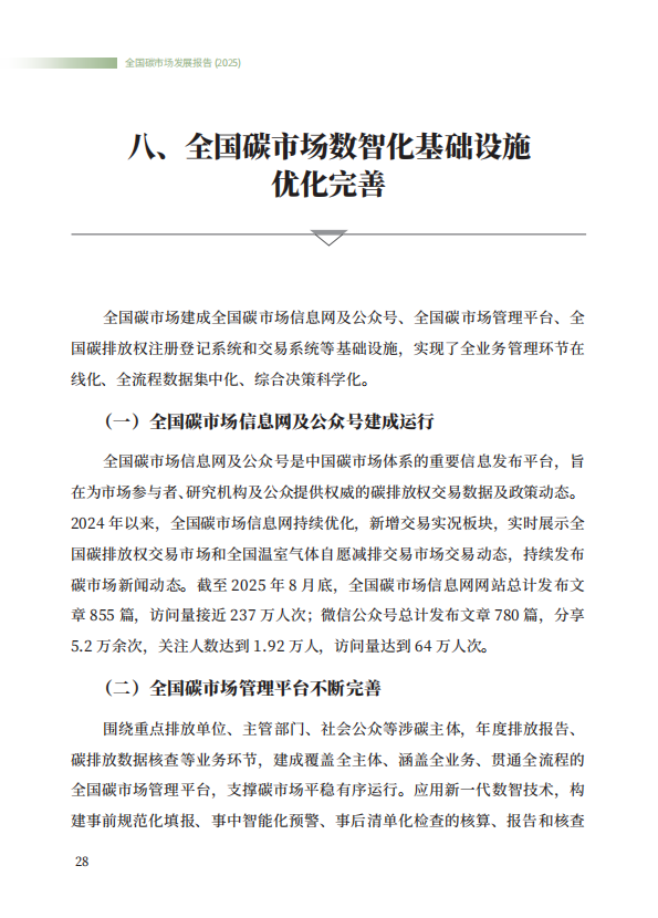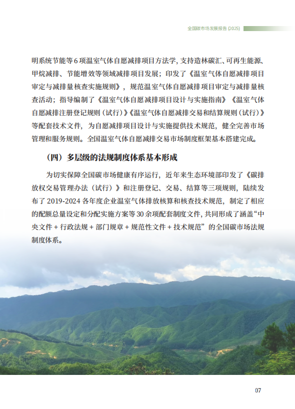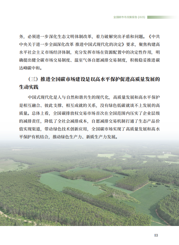 《全国碳市场发展报告(2025)》系统总结了全国碳排放权交易市场和全国温室气体自愿减排交易市场的最新建设进展,全方位展示了市场建设运行成效,展望了全国碳市场未来发展方向,是继2024年《全国碳市场发展报告(2024)》之后,生态环境部发布的全国碳市场最新进展情况报告。